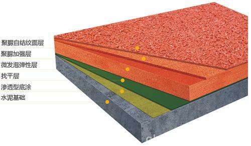 全塑型塑膠跑道分兩層�(jié)�(gòu),底層以再生膠粒與單組份膠水按比例混合攪拌后�(jīng)由專�(yè)施工�(duì)鋪設(shè)壓平,面層由EPDM橡膠顆粒與單組份膠水混合而成,厚度為13mm�